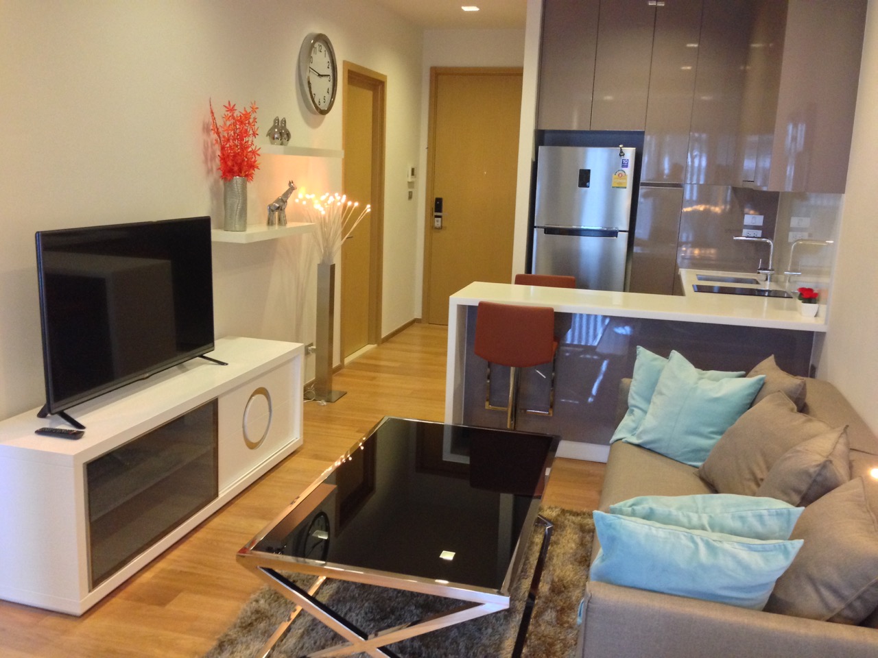 Fully Furnished:Decorated and furnished in modern, luxurious style – 50 inch TV in the living room, 42 inch TV in the bedroom, top notch washing and drying machine, full kitchen, white leather king size bed with high quality mattress, central air condition that can be operated separately for the bedroom and the living room. Electric Yale door, that can be opened by code, keycard and key.