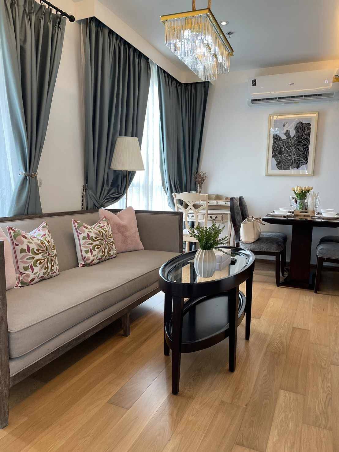 H43, size 2 bedrooms, 2 rooms, has a bathtub and shower in both rooms, 65 sq m, 8A floor, corner room, front view, Baan Suan Phra Phi Nang, 6 foot King size bed, with bathtub and 5 foot Queen Size, for rent 50000 price along with a newly installed oven + 2 washing machines with built-in drying systems.